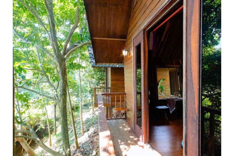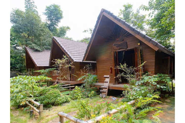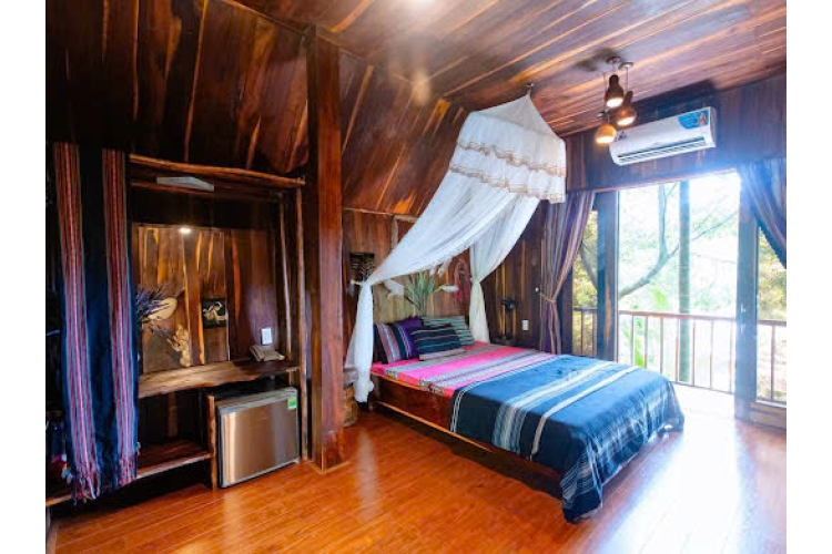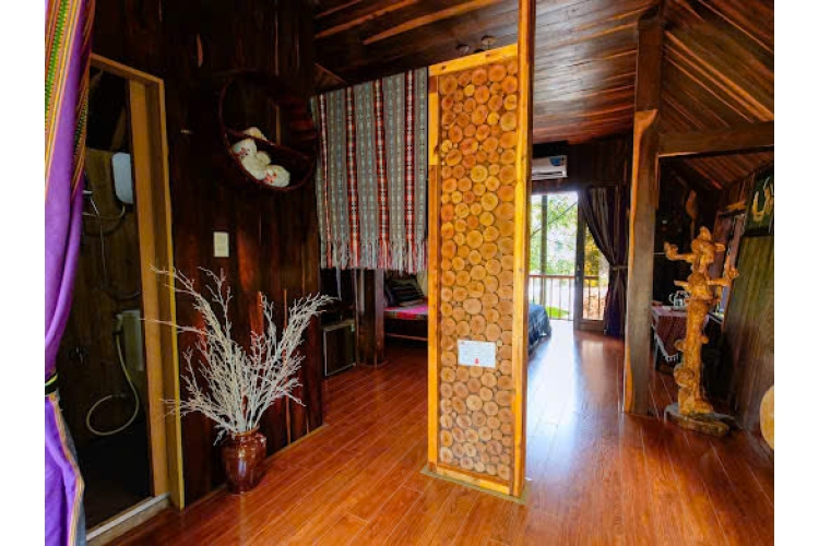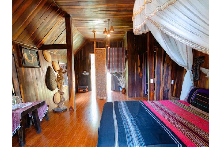 Phòng Bungalow được xây dựng hoàn toàn từ gỗ tự nhiên, hòa mình giữa không gian xanh mát của rừng cây và tiếng suối róc rách ngay bên hiên. Kiến trúc mang đậm phong cách nhà gỗ Êđê truyền thống, mái dốc nhẹ, vách gỗ nâu trầm và nội thất thủ công tinh tế. Bên trong, chăn ga thổ cẩm rực rỡ cùng ánh sáng vàng ấm tạo nên cảm giác vừa sang trọng vừa gần gũi. Ban công hướng ra thiên nhiên, nơi du khách có thể ngắm bình minh, hít thở không khí trong lành và lắng nghe âm thanh của núi rừng. Mỗi chi tiết trong phòng – từ chiếc giường, rèm voan, bàn tre nhỏ đến họa tiết thổ cẩm – đều được sắp đặt khéo léo để mang lại trải nghiệm nghỉ dưỡng đậm chất Tây Nguyên.