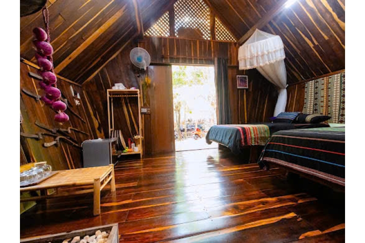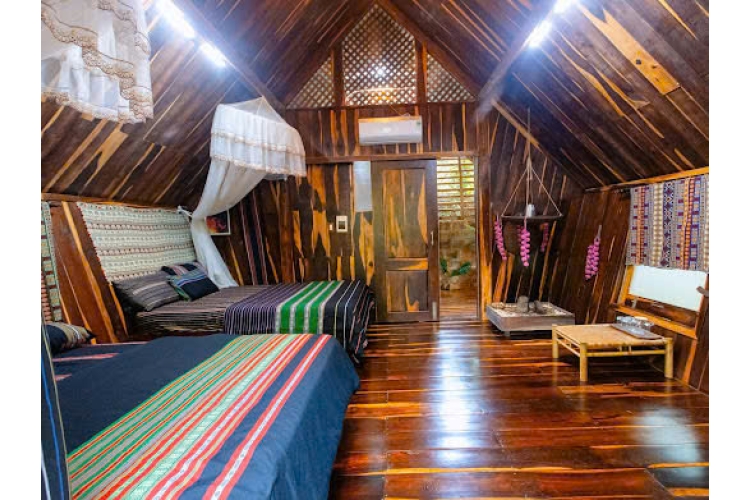 Phòng homestay được thiết kế theo kiến trúc nhà gỗ Êđê truyền thống, mang vẻ mộc mạc mà tinh tế. Toàn bộ nội thất đều làm từ gỗ tự nhiên, điểm xuyết bằng họa tiết thổ cẩm thủ công tạo nên không gian ấm cúng và gần gũi. Ánh sáng vàng nhẹ hòa cùng mùi gỗ thơm, tiếng suối róc rách ngoài hiên và làn gió mát từ núi rừng khiến du khách như được sống giữa thiên nhiên Tây Nguyên hoang sơ mà bình yên. Đây là nơi lý tưởng để nghỉ ngơi, thư giãn và cảm nhận trọn vẹn hồn quê Êđê – giản dị nhưng đầy cuốn hút.