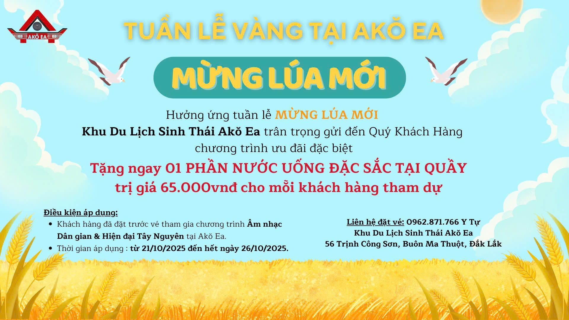 Từ ngày 21/10/2025 đến 26/10/2025, mỗi du khách khi đặt vé tham gia chương trình Âm nhạc Dân gian & Hiện đại Tây Nguyên tại Akŏ Ea sẽ được tặng ngay 01 phần nước uống đặc sắc tại quầy, trị giá 65.000đ. Đây là món quà tri ân dành cho quý khách khi ghé thăm, thưởng thức văn hóa – ẩm thực và không khí trong lành giữa lòng Buôn Ma Thuột.