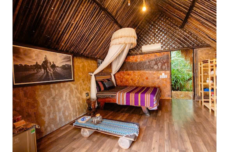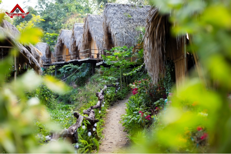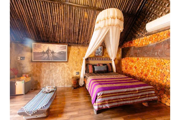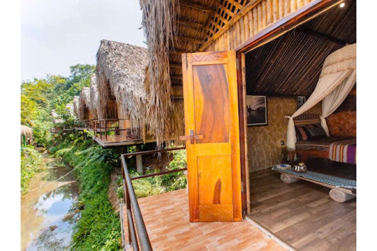 Ẩn mình bên dòng suối hiền hòa, những căn nhà ven suối được dựng hoàn toàn từ gỗ tự nhiên, mái tranh mộc mạc, mang đậm hơi thở của núi rừng Tây Nguyên. Bên trong, không gian được trang trí theo phong cách Êđê truyền thống: tường đất nâu, chùm bắp treo, nồi đất, vật dụng tre nứa, tất cả tạo nên cảm giác ấm áp và thân thuộc. Chăn ga gối nệm thổ cẩm thủ công mang sắc màu rực rỡ của buôn làng Êđê, khiến căn phòng vừa mộc mạc vừa nghệ thuật. Tiếng nước suối róc rách, mùi gỗ mới, ánh sáng vàng len qua vách tre – tất cả hòa quyện thành một bức tranh yên bình, giúp du khách chạm đến sự an yên và trải nghiệm trọn vẹn bản sắc văn hóa Êđê giữa lòng thiên nhiên.